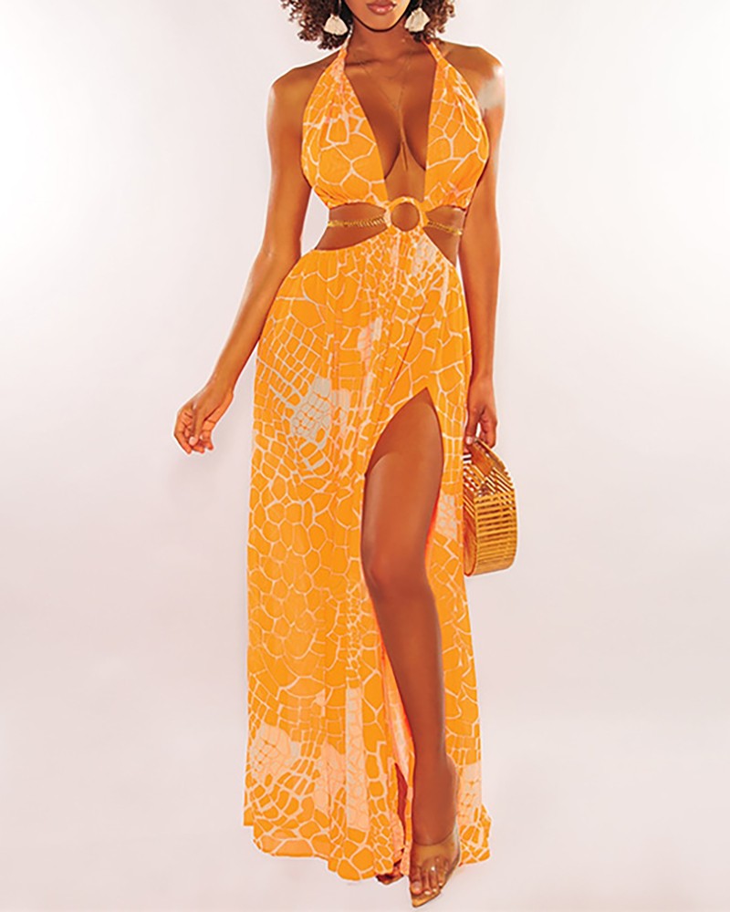 Snakeskin Print O Ring Cutout High Slit Maxi Dress
